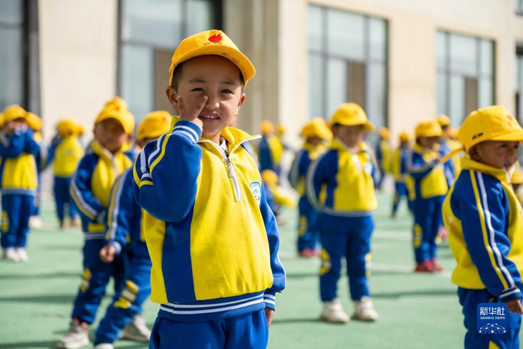 在西藏自治區(qū)山南市貢嘎縣森布日村,霍黨生在幼兒園準(zhǔn)備跳課間操(3月22日攝)。新華社記者 周荻瀟 攝