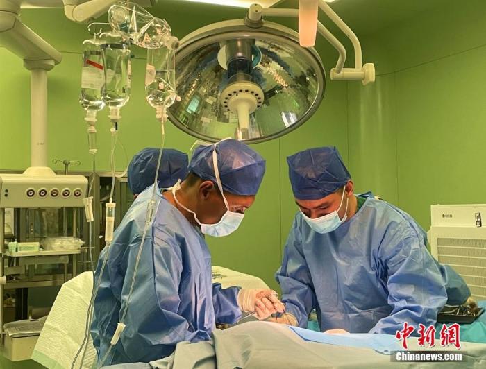 圖為5月7日,次仁云丹(左)在拉薩為患者進(jìn)行手術(shù)治療。 中新社記者 冉文娟 攝