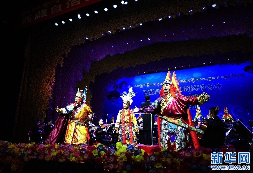 2015年12月30日晚,在拉薩舉行的西藏自治區(qū)2016年《吉祥彩虹》新年音樂(lè)會(huì)上,演員表演格薩爾說(shuō)唱。新華社記者 晉美多吉攝