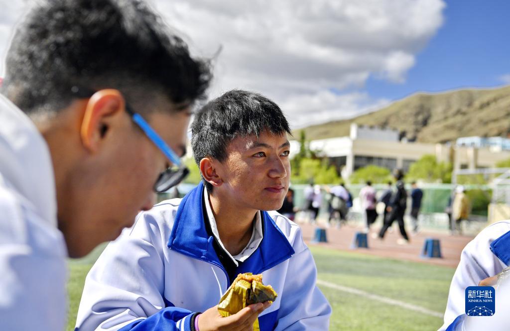 山南市第二高級(jí)中學(xué)的學(xué)生在操場(chǎng)吃粽子(6月3日攝)。新華社記者 劉洲鵬 攝