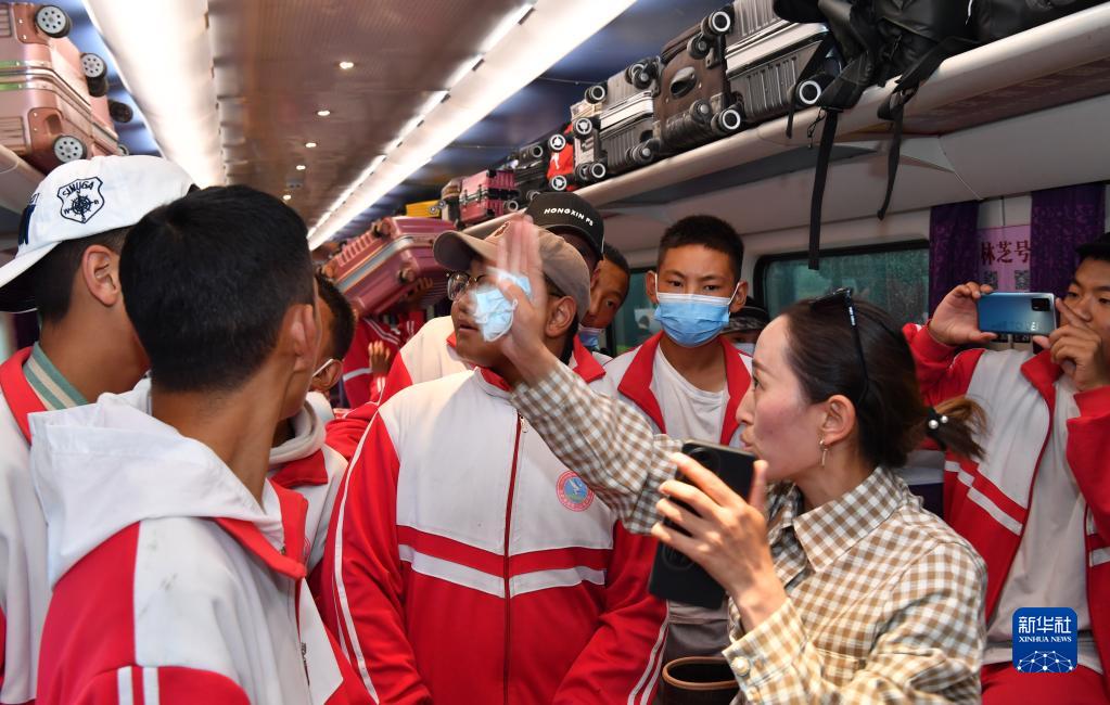7月17日,拉薩那曲第三高級中學(xué)高一(15)班班主任次仁曲珍(右二)在車廂里向?qū)W生們囑咐注意事項(xiàng)。新華社記者 覺果 攝