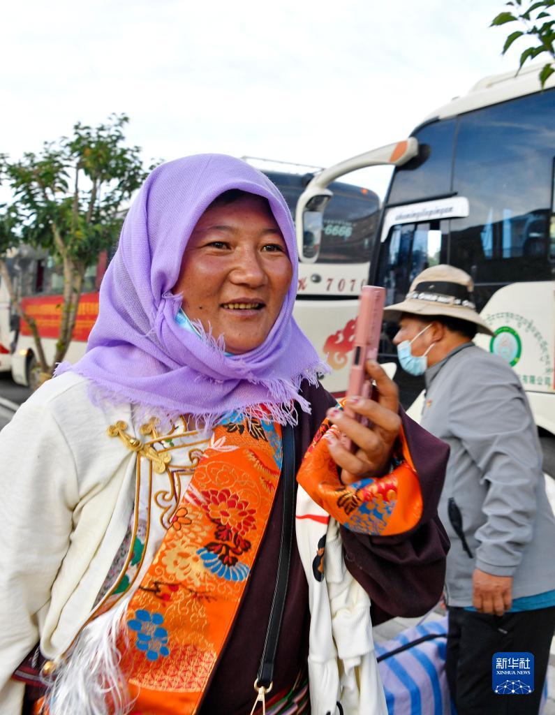 剛剛抵達(dá)森布日安置點(diǎn)的雙湖縣牧民在給親朋打電話報(bào)平安(7月19日攝)。新華社記者 張汝鋒 攝
