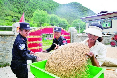 西藏移民管理警察幫助邊境群眾收青稞。伍俊丞攝/光明圖片