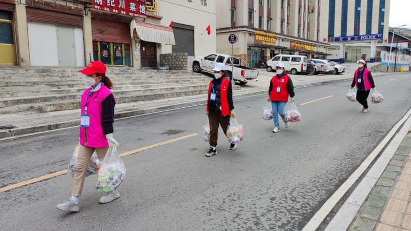 洛隆縣孜托鎮(zhèn)德康社區(qū)新時代文明實踐志愿者為社區(qū)居家隔離人員配送物資。圖片由昌都市文明辦提供