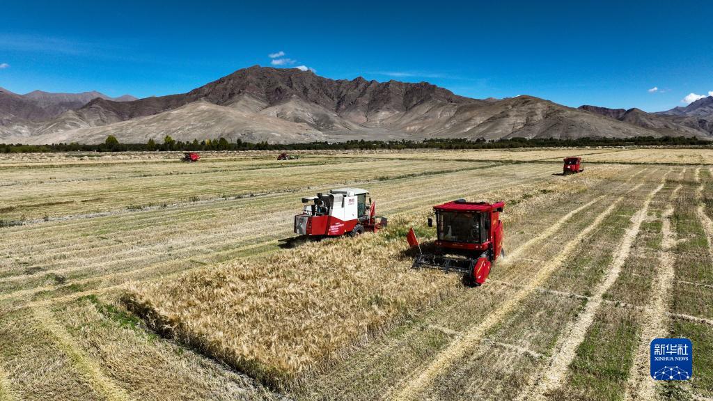 西藏日喀則市江孜縣熱索鄉(xiāng)努康村農(nóng)機合作社的村民集中對村里三千多畝耕地進行機械化收割(9月19日攝)。新華社記者 晉美多吉 攝