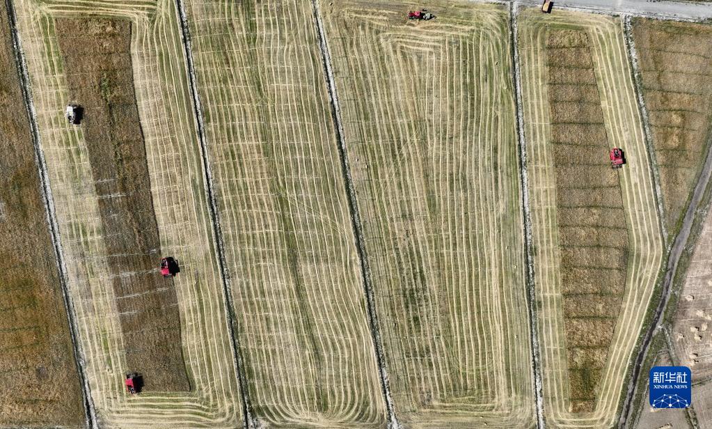 西藏日喀則市江孜縣熱索鄉(xiāng)努康村農(nóng)機合作社的村民集中對村里三千多畝耕地進行機械化收割(9月19日攝,無人機照片)。新華社記者 晉美多吉 攝