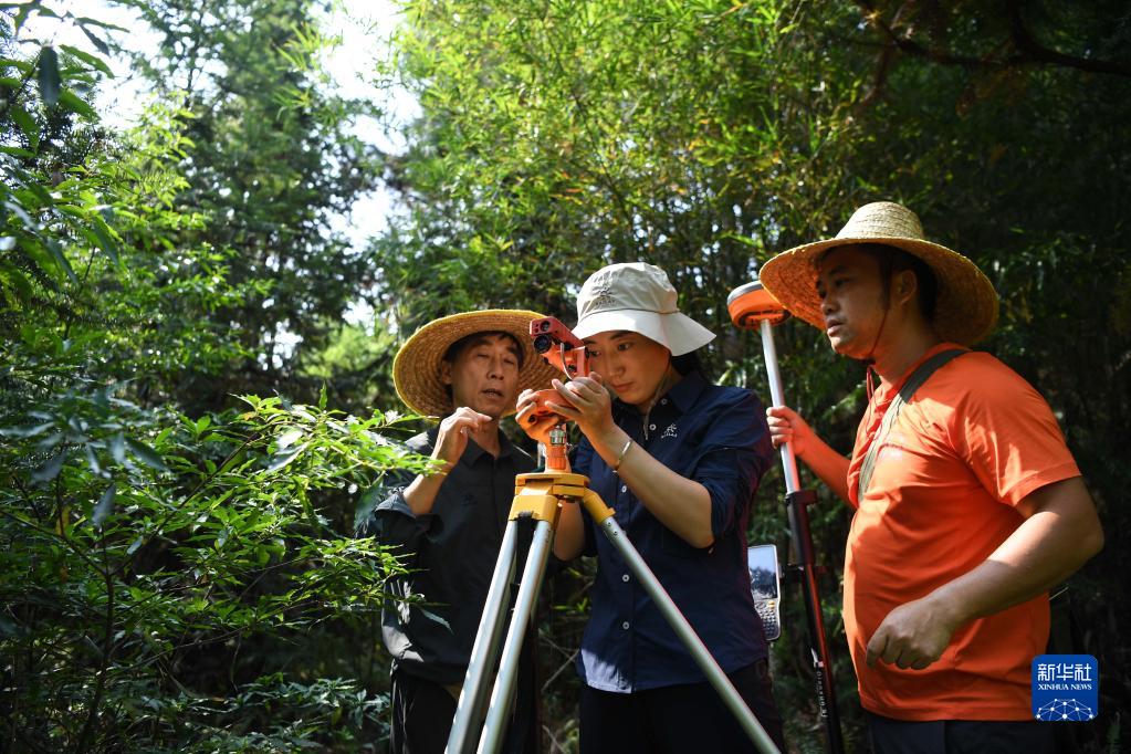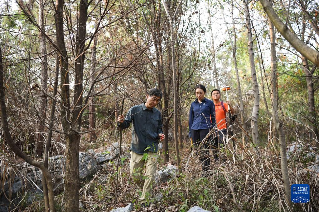 9月21日,在廣東韶關樂昌市秀水鎮(zhèn)大羅嶺村,白拉曲珍(中)和師傅江建發(fā)(前)、同事伍國清在石漠化生態(tài)恢復監(jiān)測平臺固定樣地工作。新華社記者 鄧華 攝