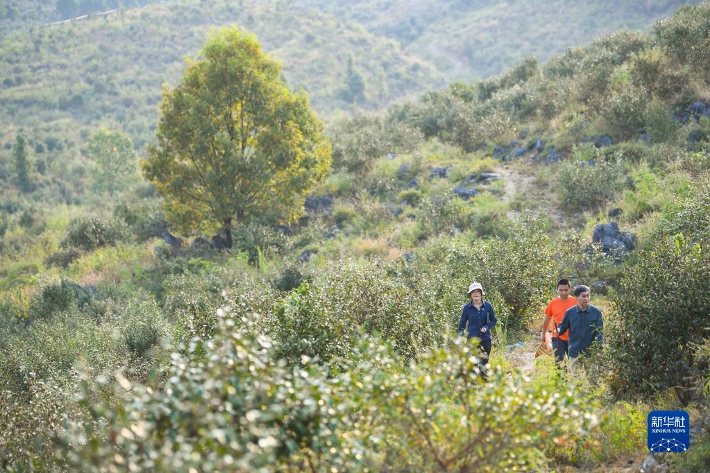 9月21日,在廣東韶關樂昌市梅花鎮(zhèn)流山村,白拉曲珍(左)和師傅江建發(fā)(右)、同事伍國清來到石漠化綜合治理的油茶種植基地查看油茶生長情況。新華社記者 鄧華 攝