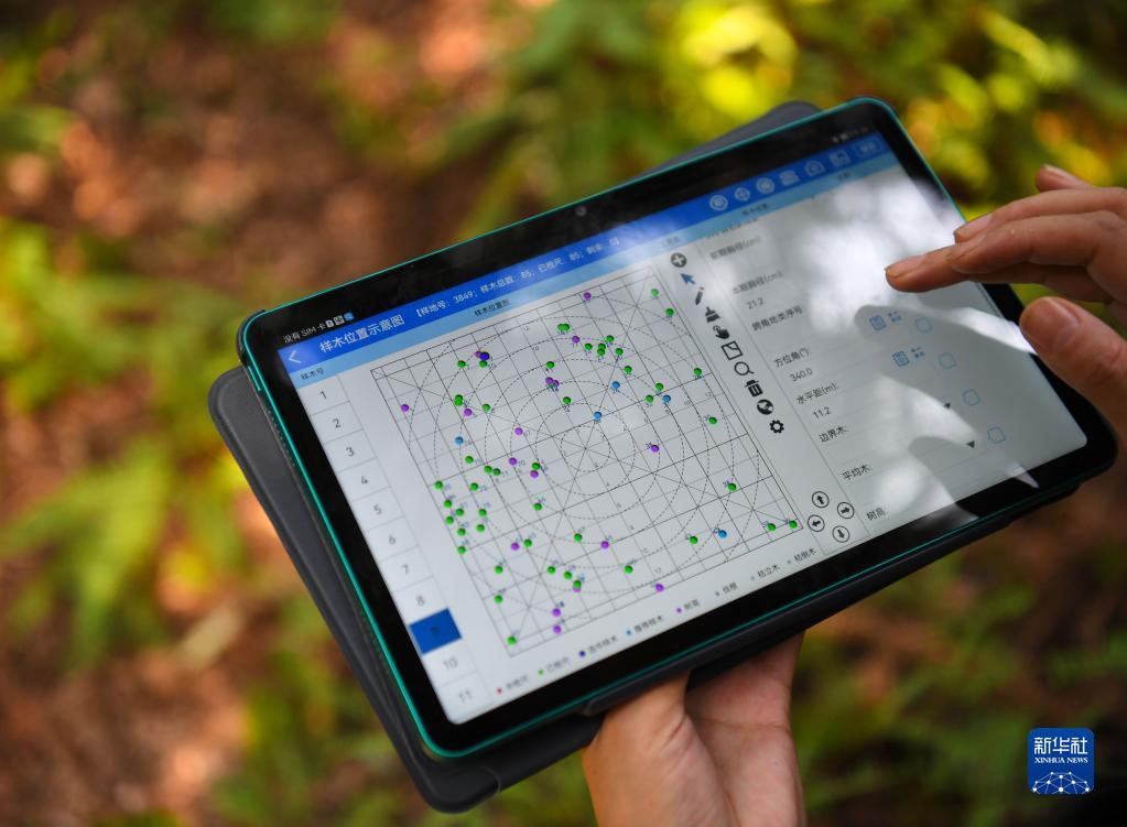 9月22日,在廣東韶關樂昌市張溪村的生態(tài)監(jiān)測樣地,白拉曲珍查看軟件數(shù)據(jù)。新華社記者 鄧華 攝