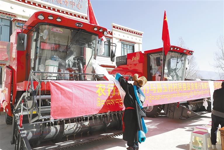 農(nóng)行拉薩分行向該行駐村點尼木縣聶玉村捐贈大型收割機。