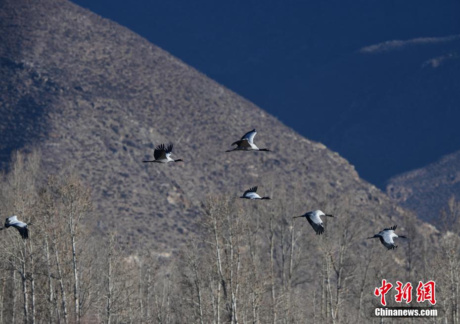 每年的10月底,成群的黑頸鶴飛到西藏拉薩市林周縣越冬,在拉薩市林周縣周邊的湖泊濕地度過(guò)5個(gè)月的“閑云野鶴”生活,次年三四月份再飛向藏北草原繁殖。黑頸鶴是世界上唯一一種高原鶴類。具有足長(zhǎng)、喙長(zhǎng)、頸長(zhǎng)的典型涉禽類特征,適合在沼澤地里行走。黑頸鶴的頸、尾為黑色,體羽為灰白色。黑頸鶴是國(guó)家一級(jí)保護(hù)動(dòng)物。目前,每年到林周縣越冬的黑頸鶴已達(dá)2000只左右。圖為黑頸鶴在林周境內(nèi)的農(nóng)田上空飛翔。 貢嘎來(lái)松 攝