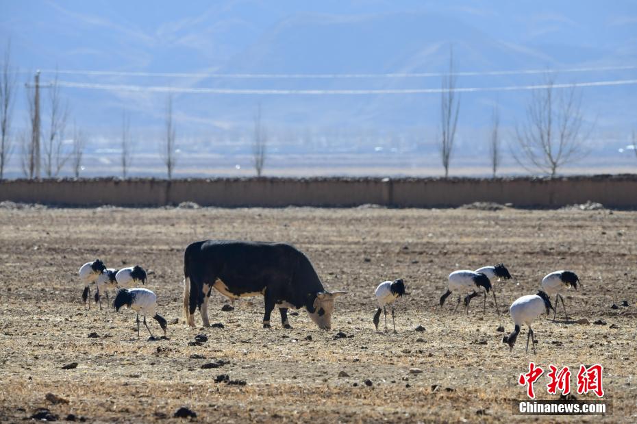 每年的10月底,成群的黑頸鶴飛到西藏拉薩市林周縣越冬,在拉薩市林周縣周邊的湖泊濕地度過(guò)5個(gè)月的“閑云野鶴”生活,次年三四月份再飛向藏北草原繁殖。黑頸鶴是世界上唯一一種高原鶴類。具有足長(zhǎng)、喙長(zhǎng)、頸長(zhǎng)的典型涉禽類特征,適合在沼澤地里行走。黑頸鶴的頸、尾為黑色,體羽為灰白色。黑頸鶴是國(guó)家一級(jí)保護(hù)動(dòng)物。目前,每年到林周縣越冬的黑頸鶴已達(dá)2000只左右。圖為黑頸鶴在林周境內(nèi)的農(nóng)田里覓食。 貢嘎來(lái)松 攝