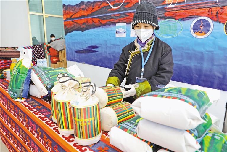 在日土縣展銷區(qū),工作人員在擺放特色產品。記者 永青 攝