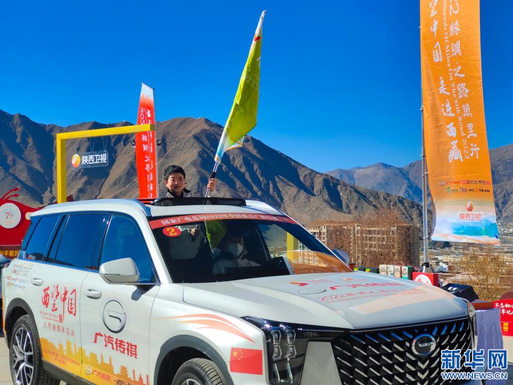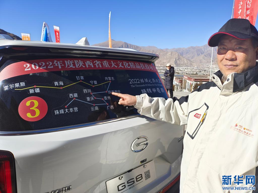 在拉薩市文成公主實(shí)景劇場(chǎng)前的廣場(chǎng)上,一列車隊(duì)緩緩駛過(guò)。有人從天窗探出身子揮舞著旗幟,旗上寫著:“2022絲綢之路萬(wàn)里行,西望中國(guó)”。