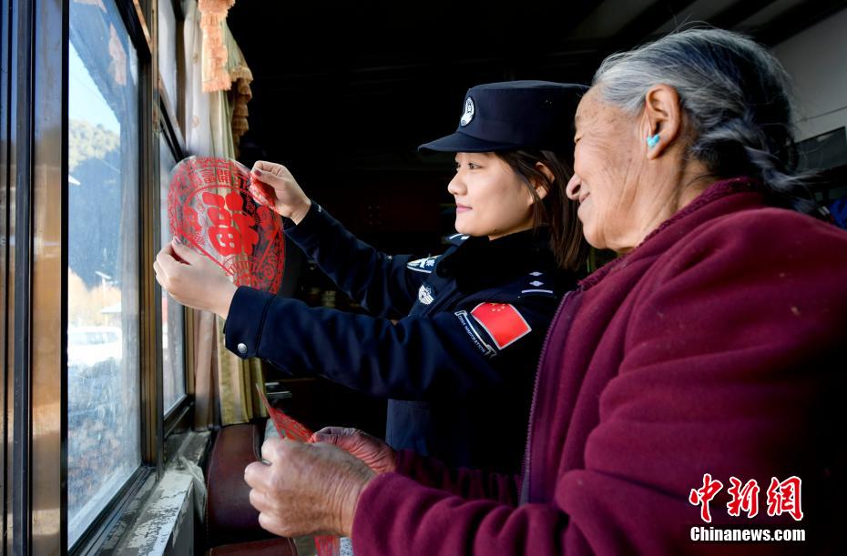 1月5日,移民警察為藏族老阿媽貼窗花。 李林 攝
