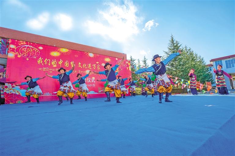 西藏自治區(qū)歌舞團演員們表演精彩的舞蹈節(jié)目。通訊員 張啟 記者 格桑倫珠 攝