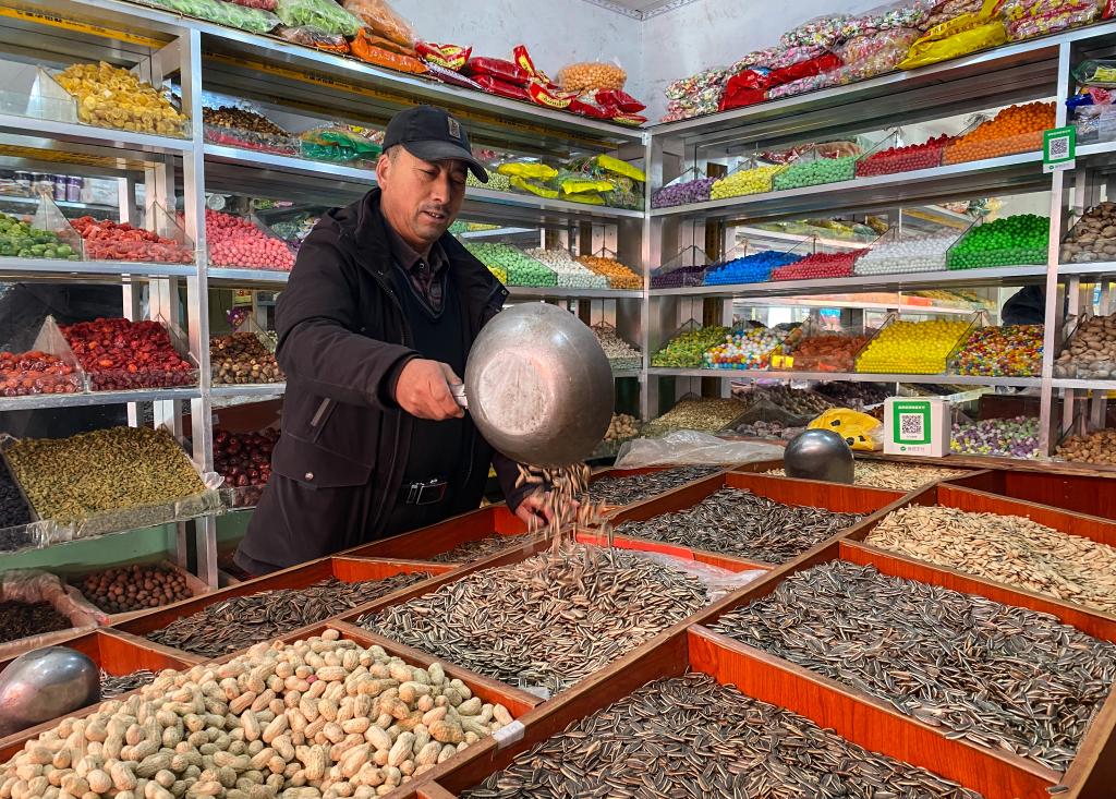2月1日,王西木售賣干果和各色糖果。新華社記者春拉 攝