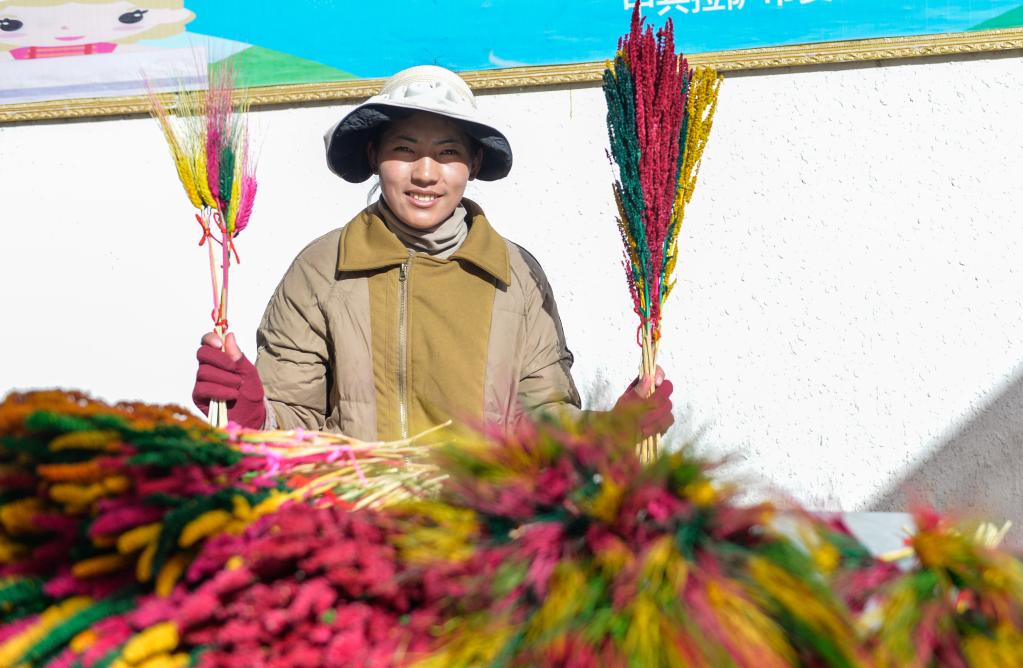 2月2日,商販展示自己制作的五彩青稞穗。新華社記者晉美多吉 攝