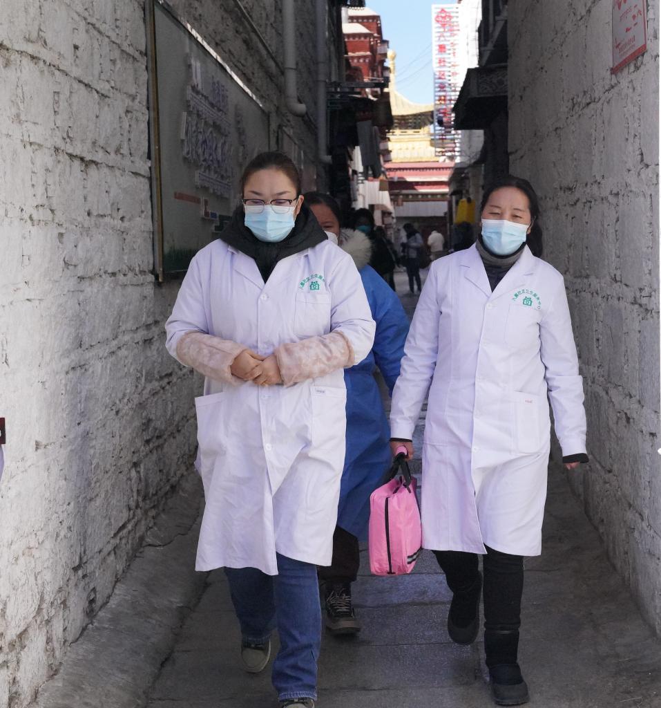 拉薩市八廓街道內(nèi),醫(yī)生拉吉(右一)和她的同事們在入戶隨訪途中。新華社記者黃耀漫 攝
