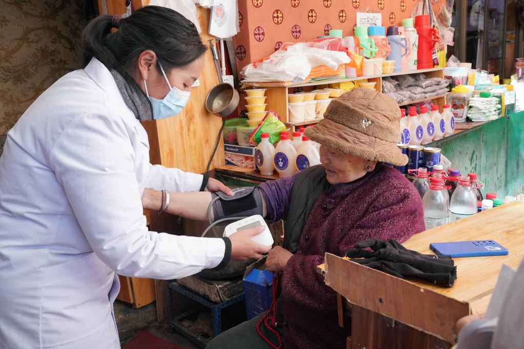 醫(yī)生為拉薩市八廓街道居民次仁卓瑪(右)測量血壓。新華社記者黃耀漫 攝