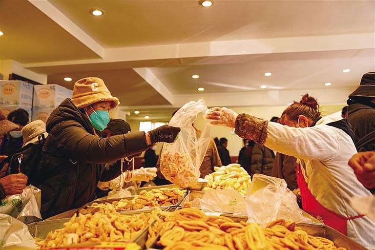 不遠(yuǎn)處,尼珍藏式卡塞店的店員們正忙著制作“卡塞”,揉面、切割、染色,面片經(jīng)店員們的巧手捏成長(zhǎng)條形、圓形、蝴蝶形等不同樣式,最后放到油鍋炸至金黃,出鍋后瀝油再撒上白糖,香甜可口、樣式精美的卡塞就制作完成了。新鮮出爐的卡塞顏色金黃、香氣四散開(kāi)來(lái),市民們爭(zhēng)相選購(gòu)。“我們做卡塞已經(jīng)25年了,今年1月10日開(kāi)門營(yíng)業(yè),很多老顧客就來(lái)光顧了,每天收入在2000元至3000元之間,而且我們選用的原材料比較好,再加上現(xiàn)場(chǎng)制作、新鮮銷售,生意好的時(shí)候賣得更多?!崩习迥嵴涓嬖V記者:“我們店制作的卡塞價(jià)格實(shí)惠,連續(xù)8年沒(méi)有漲價(jià),每斤30元,今年準(zhǔn)備營(yíng)業(yè)到藏歷十二月二十九(公歷2月19日)歇業(yè)?!?/p>