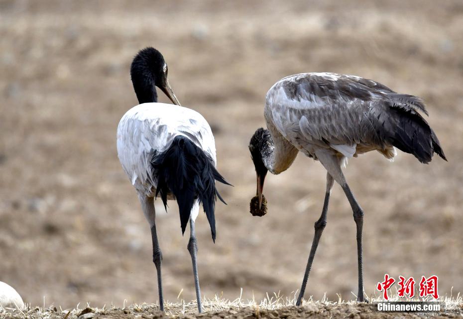2月19日,黑頸鶴與幼鶴在田間覓食。
