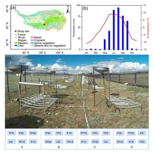 研究站點(diǎn)植被類型(a)、氣象條件(b)和實(shí)驗(yàn)設(shè)計(jì)(c)。中科院青藏高原所 供圖
