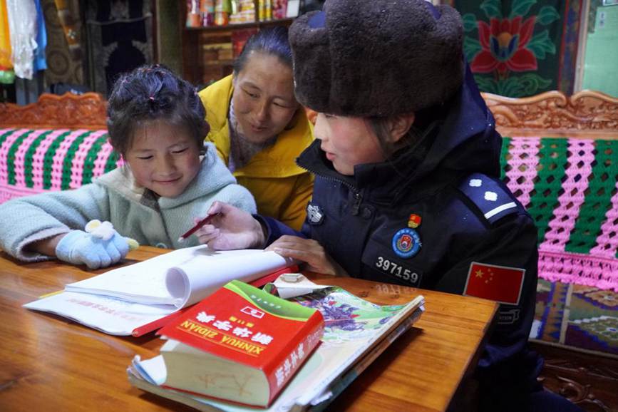 為孩子輔導作業(yè)。圖片由玉麥鄉(xiāng)邊境派出所提供