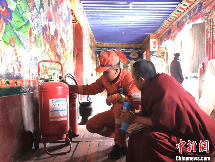 “景區(qū)內(nèi)的宗教寺廟木質(zhì)結(jié)構(gòu)比較多,周圍森林資源豐富,平時要注意用火安全,防止火災(zāi)發(fā)生?!边@是林芝市森林支隊消防員正在為德木寺景區(qū)工作人員和僧人宣傳森林消防安全常識。