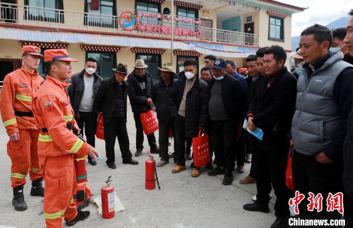 林芝市森林消防支隊指戰(zhàn)員正在講解滅火器的使用方法。西繞拉翁 攝
