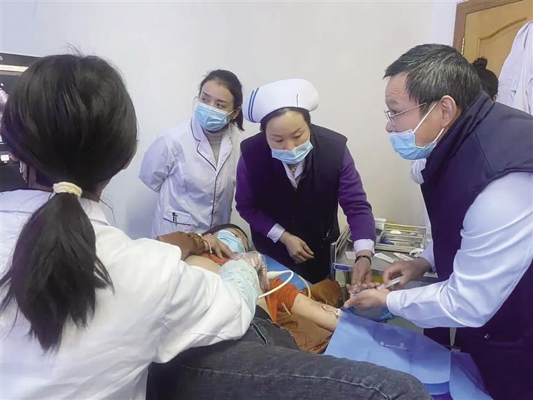 西藏自治區(qū)人民醫(yī)院超聲醫(yī)學科主任尼瑪玉珍操作超聲探頭(右二)。圖由西藏自治區(qū)人民醫(yī)院提供