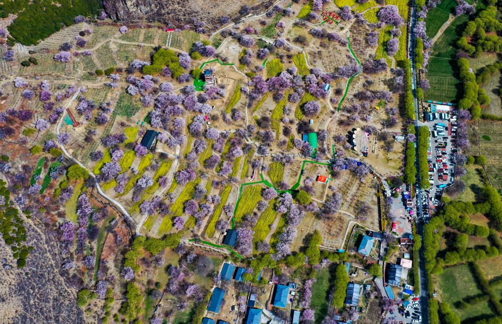 鳥瞰桃花盛開的嘎拉村,停滿了旅游車輛(無人機照片,3月24日攝)。新華社記者 姜帆 攝