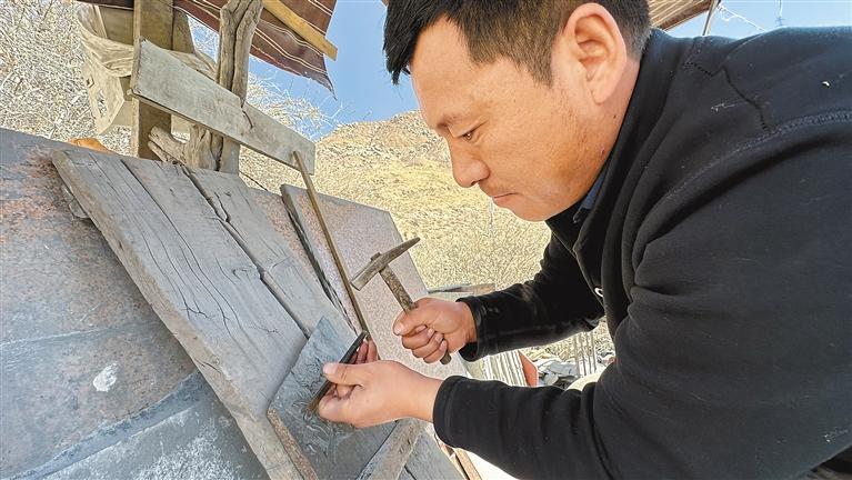 今年35歲的桑周才仁出生在石刻世家,父輩都是石匠,算起來他也是家族石刻技藝的第六代傳承人了。自幼,桑周才仁就對石頭有一種特殊的情感,14歲就開始接受父親的指導(dǎo),悉心學(xué)習(xí)刻字、線雕、浮雕、繪畫等與石刻相關(guān)的技藝?!翱套质鞘碳妓囍械幕A(chǔ),需要反復(fù)練習(xí),刻不好就得磨掉重做,直到刻出滿意的作品為止?!鄙V懿湃蕦τ浾哒f,當(dāng)時(shí)聽到父親一句“刻得很好”的評價(jià),他就能高興一整天。
