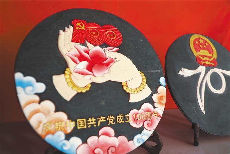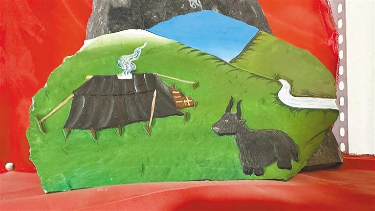 “我們首先要選好一塊石頭,根據(jù)它的形狀和質(zhì)地來決定刻成一幅什么樣的作品,然后再畫出作品的輪廓進(jìn)行雕刻,最后一步則為上色?!鄙V懿湃薀崆榈貛覀儏⒂^他的工作室,“慶祝中國共產(chǎn)黨成立100周年”“牧家生活”“扎西德勒”“白海螺”“和氣四瑞像”……每一幅作品活靈活現(xiàn)在大大小小石板上,栩栩如生、惟妙惟肖,堅(jiān)硬的石頭在他出神入化的雕工下竟變得柔軟,又不失力量和美感。