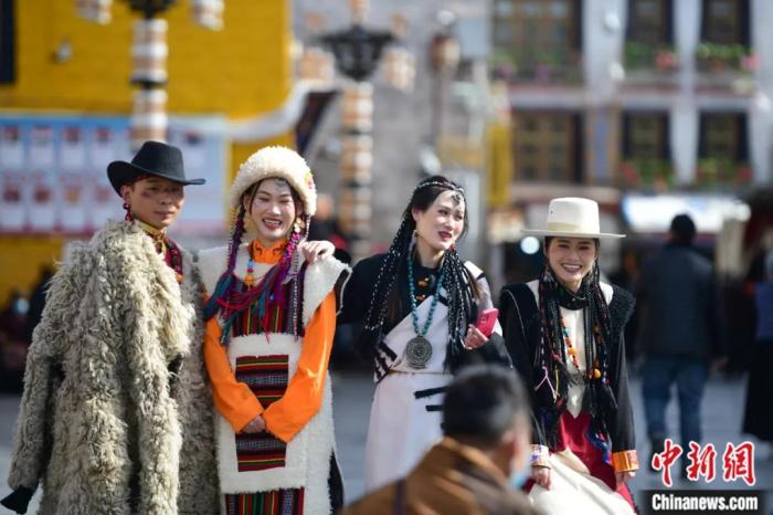 西藏拉薩,身著藏族傳統(tǒng)服飾的游客在八廓街拍照留念。貢嘎來(lái)松 攝