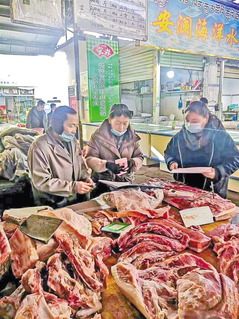 圖為拉薩市有關(guān)工作人員深入市場,查看糧油菜肉蛋奶等商品價(jià)格、供應(yīng)情況。