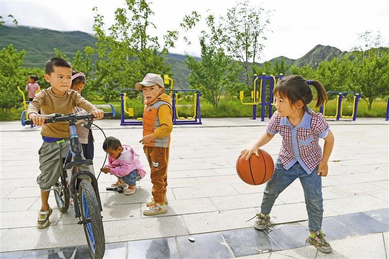 圖為山南市加查縣冷達(dá)鄉(xiāng)共康村的孩子們?cè)诟蓛粽麧嵉膹V場(chǎng)上玩耍。記者 李洲 攝