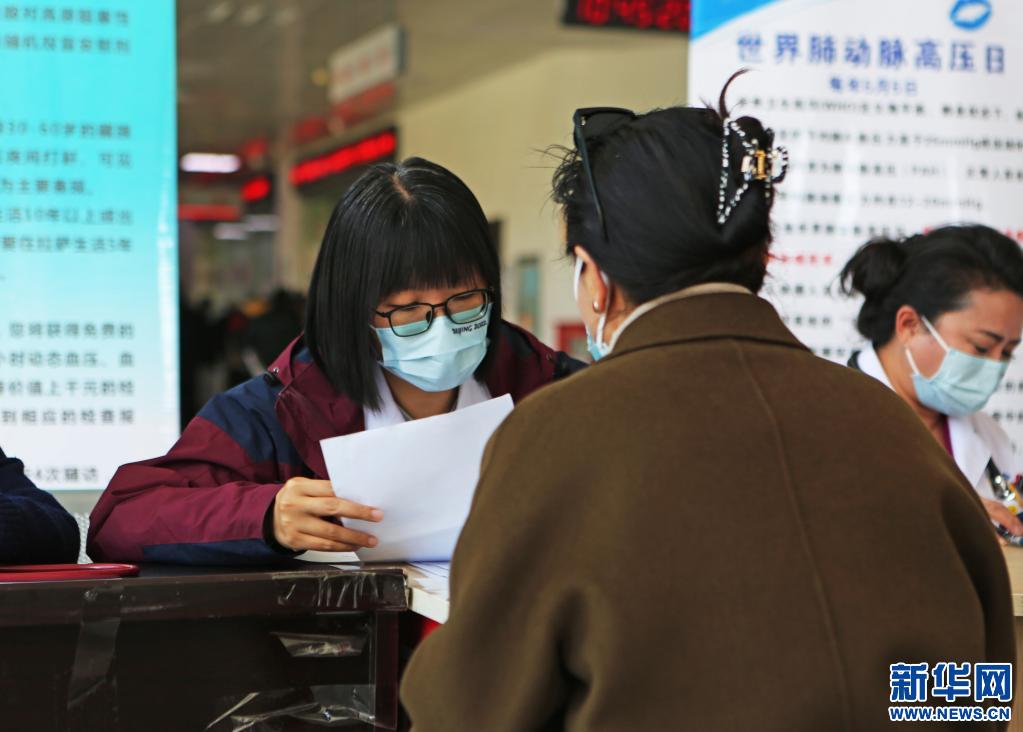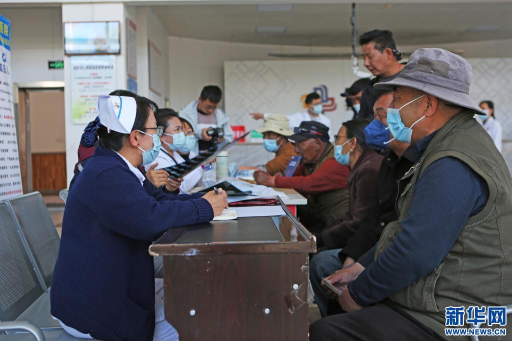 圖為“京藏?cái)y手,護(hù)佑藍(lán)唇”義診活動(dòng)現(xiàn)場,醫(yī)生在為患者測量血壓。(5月5日攝)