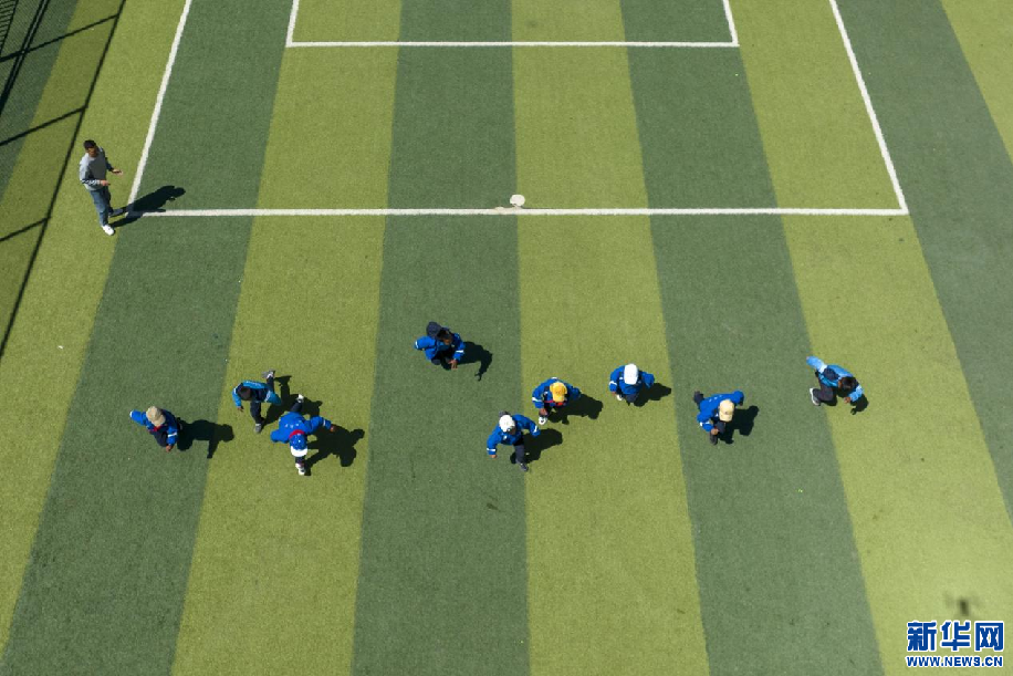 5月15日,西藏定日縣扎西宗鄉(xiāng)完全小學學生在進行賽前熱身(無人機照片)。新華網(wǎng) 旦增努布 攝
