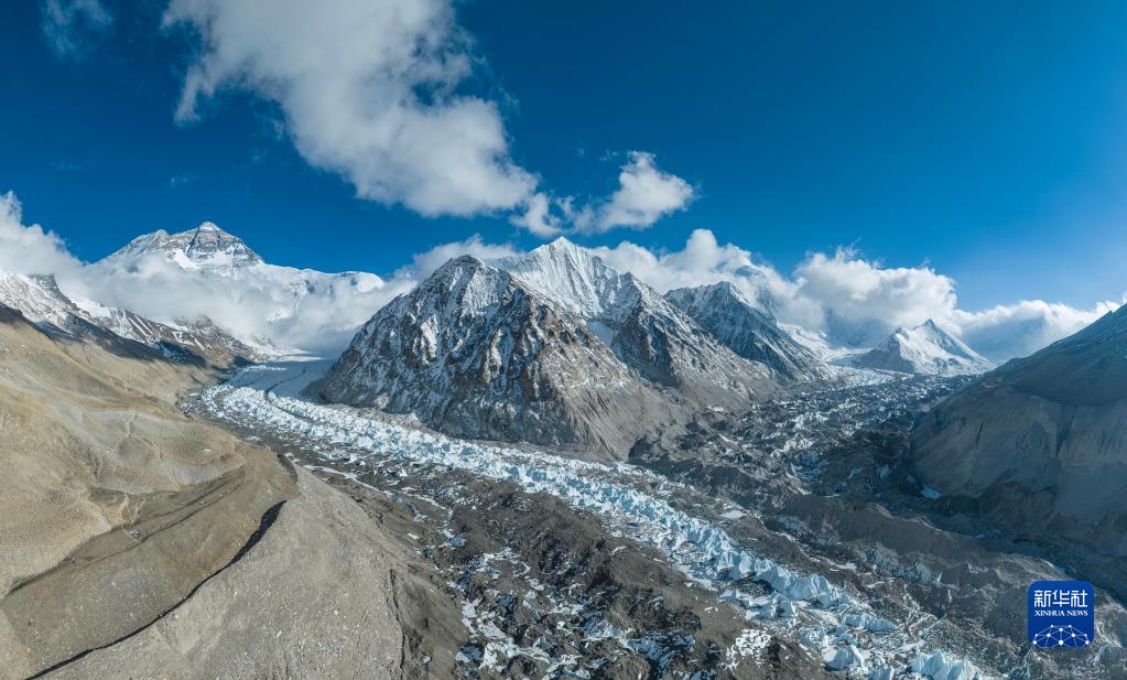 這是珠峰腳下的中絨布冰川(前)和西絨布冰川(后)(5月15日攝,無人機(jī)照片)。新華社記者 孫非 攝