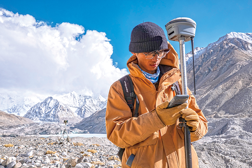 來(lái)自中國(guó)科學(xué)院西北生態(tài)環(huán)境資源研究院的科考隊(duì)員薛雨昂在對(duì)冰川進(jìn)行實(shí)時(shí)差分GPS定位(5月15日攝)。新華社記者晉美多吉攝