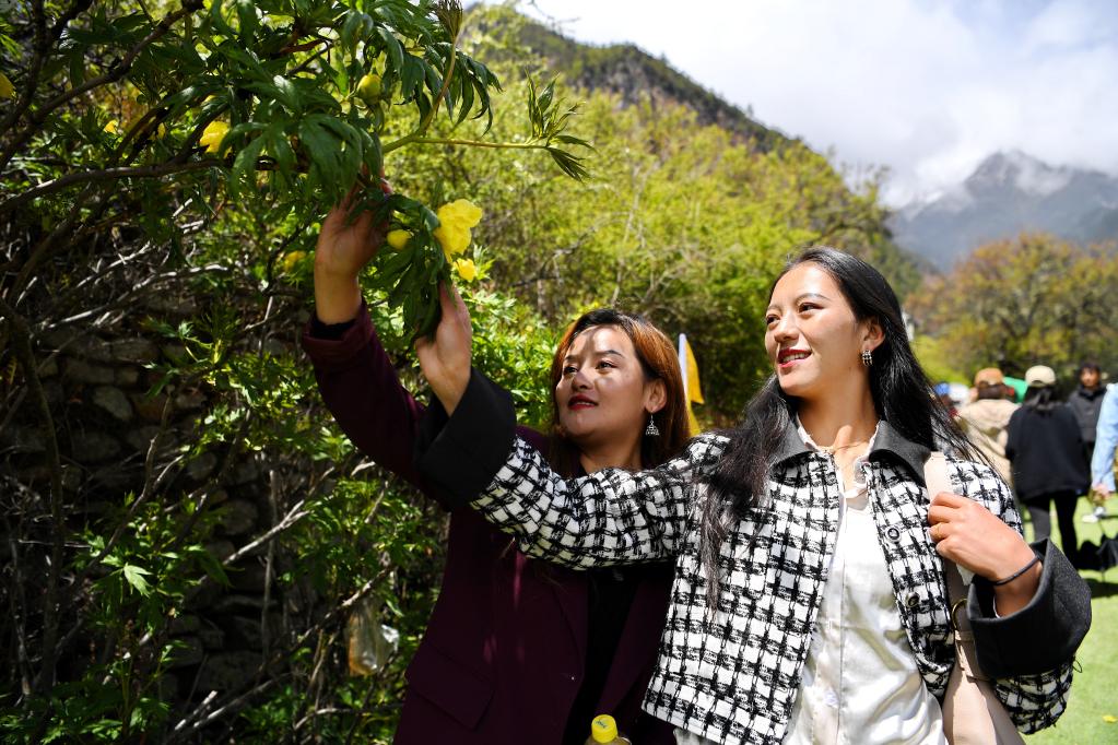 5月28日,兩名游客在米林市南伊珞巴民族鄉(xiāng)扎貢溝觀賞野生大花黃牡丹。新華社記者 張汝鋒 攝