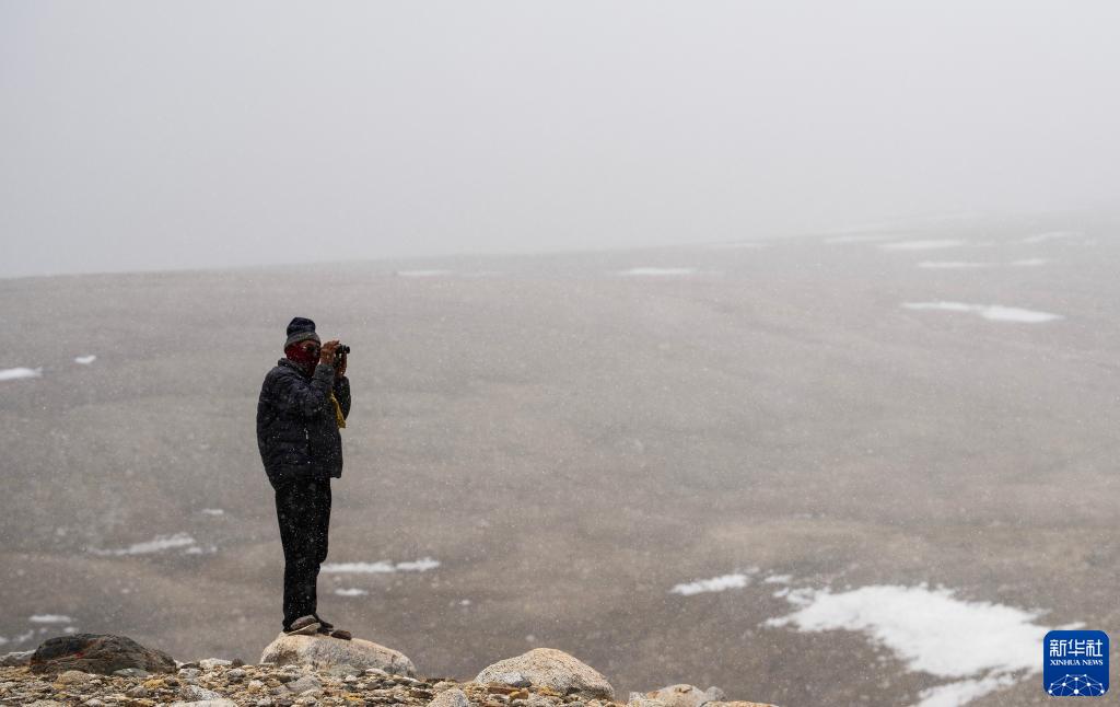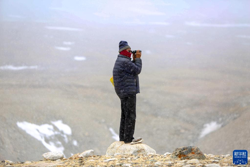 乃乃在用望遠(yuǎn)鏡查看冰川是否有異樣(5月31日攝)。新華社記者 晉美多吉 攝