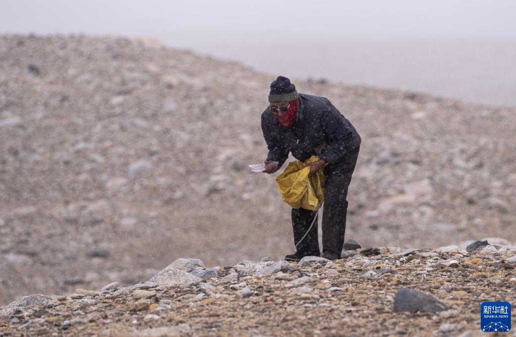 5月31日,乃乃老人在杰瑪央宗冰川山口附近撿拾垃圾。新華社記者 邵澤東 攝
