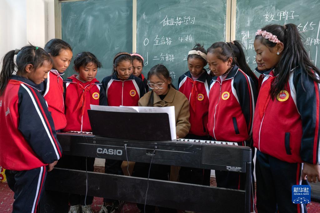 鋼琴課教室里又響起了歡快的樂曲聲,那是巴桑老師在教旦增吉宗和她的小伙伴們一首當(dāng)?shù)馗枨段业募以谌湛t》:“你的家在哪里,就在日喀則呀……日喀則是好地方……”