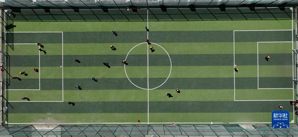 扎西宗鄉(xiāng)完全小學(xué)的學(xué)生在體育課上踢足球(6月5日攝,無人機照片)。新華社記者 晉美多吉 攝