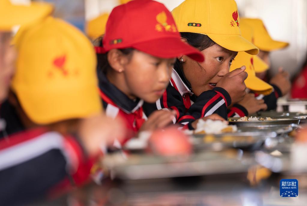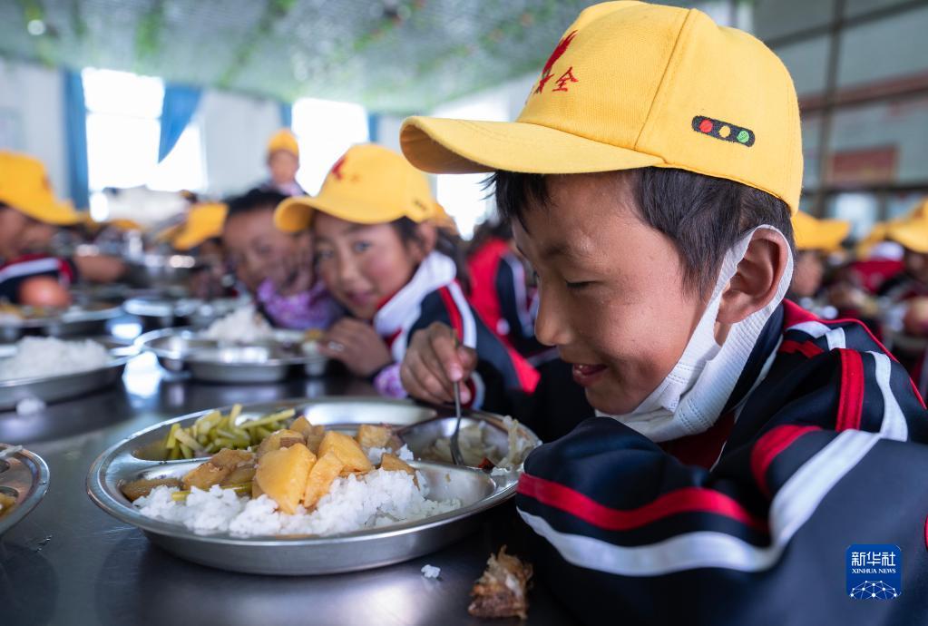 6月5日,扎西宗鄉(xiāng)完全小學(xué)的學(xué)生在食堂吃午飯。新華社記者 費茂華 攝