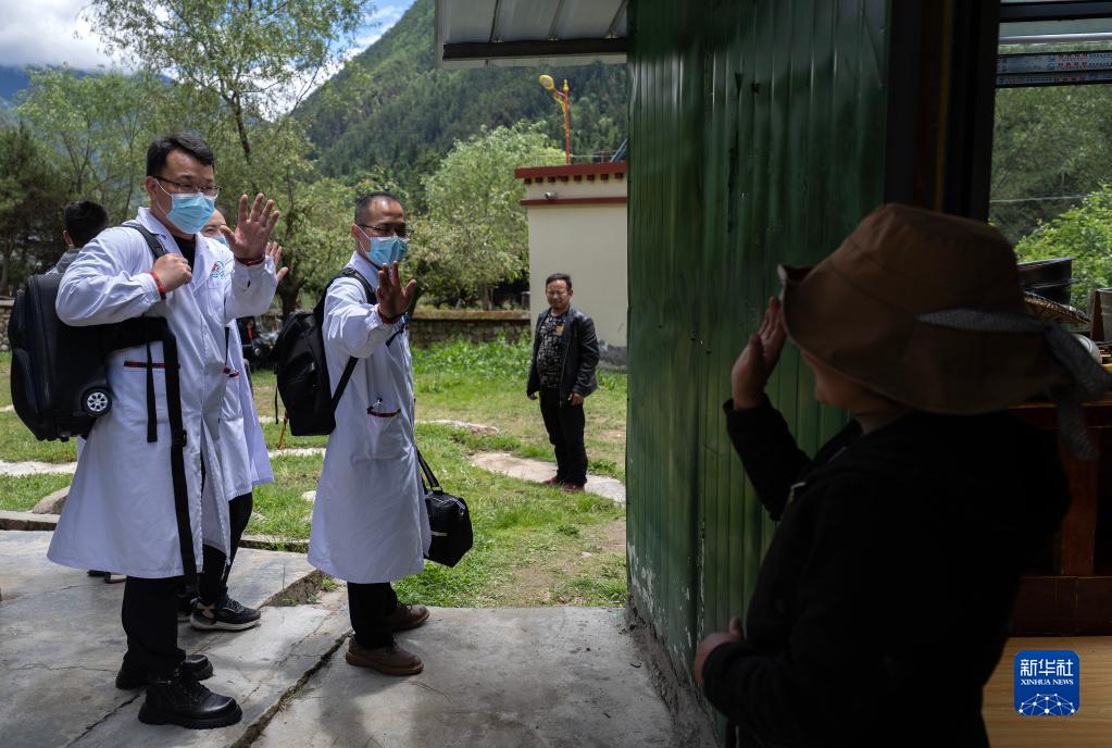 6月12日,王振疆醫(yī)生一行離開時,病人阿珍的女兒(右)和他們揮手告別。新華社記者 晉美多吉 攝