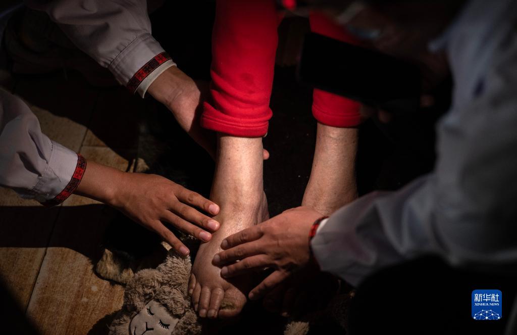 6月12日,王振疆(右二)在查看次仁旺姆的手指關(guān)節(jié)。新華社記者 費茂華 攝