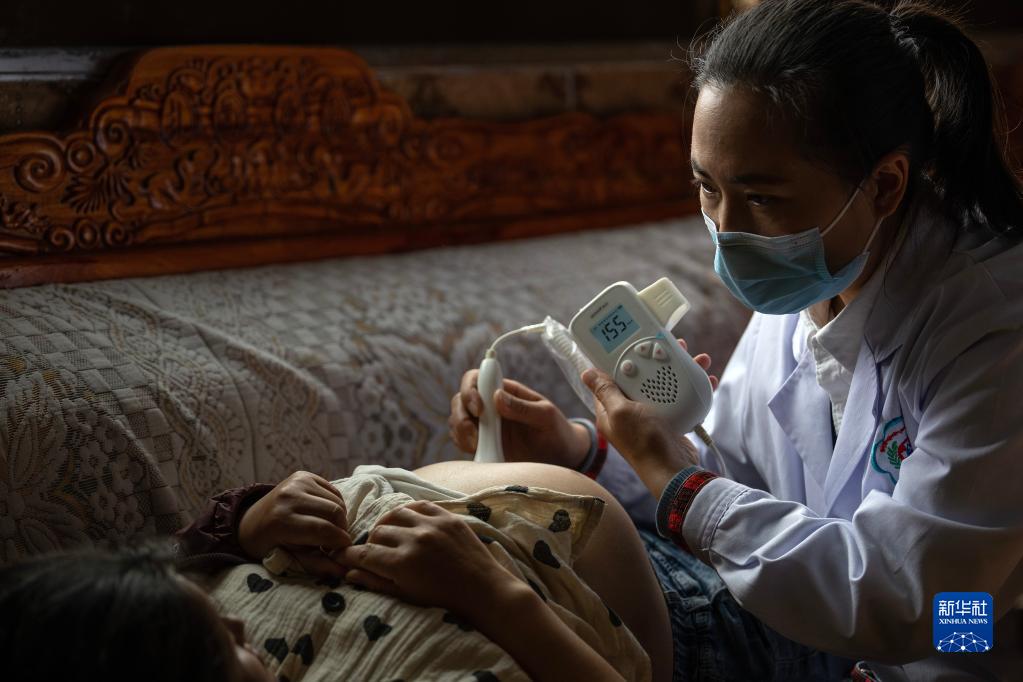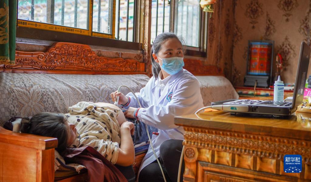 6月12日,陳冰醫(yī)生(右一)在給產(chǎn)婦扎西央宗做產(chǎn)檢。新華社記者 邵澤東 攝